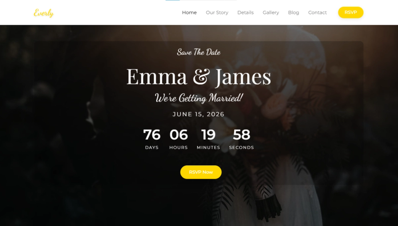 - 8 Professional Pages: Home, Story, Wedding, RSVP, Gallery, Blog, Details, Contact